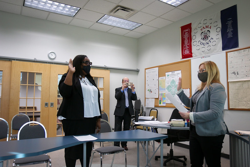 - Newly hired Assistant Tama County Attorney Geneva Williams takes the oath of office from County Auditor Laura Kopsa at Board of Supervisors meeting on Nov. 2. Tama County Attorney Brent Heeren is pictured in the back capturing video of the occasion.Williams replaces Michael Bandy who retired this fall. Darvin Graham/News Chronicle