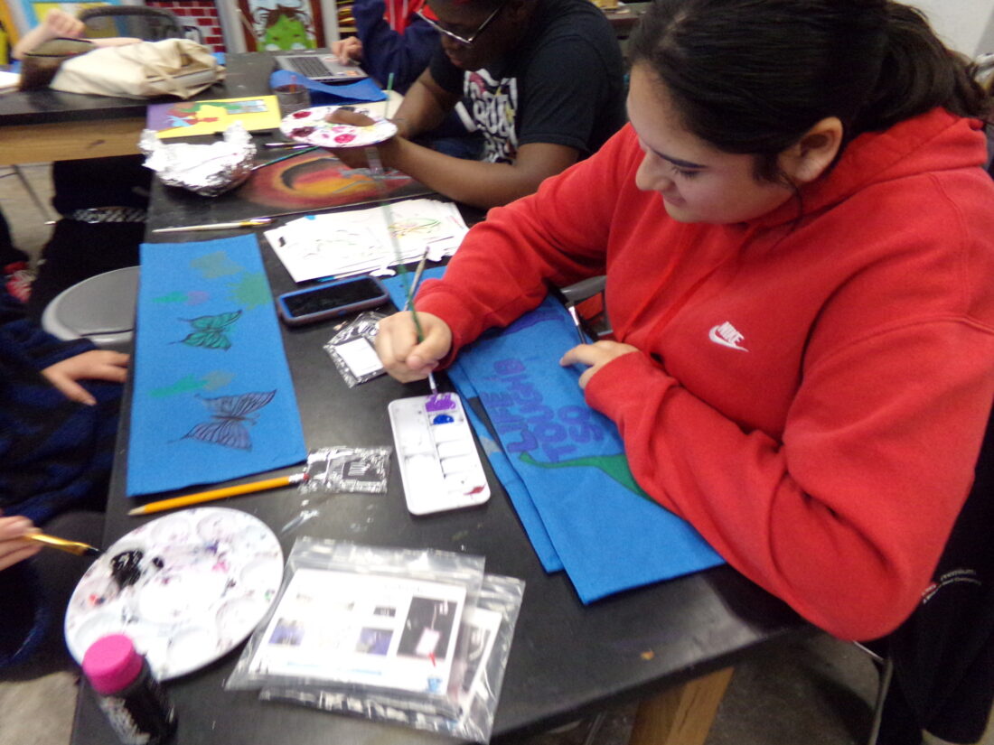 - Art Club member Arianna Herrera paints an uplifting patch for a bag that will be given to a foster child. PHOTO BY MICHAEL D. DAVIS
