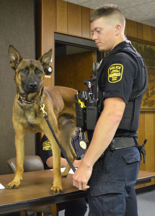 Tama Police Officer Brandon Wall’s resignation was accepted by the council. After losing a two-legged officer, with the next agenda item, the Tama Police Department welcomed a four-legged officer to the department. The K-9 officer contract was approved by the council before Officer Logan Andrews introduced the newest officer to those in attendance.
