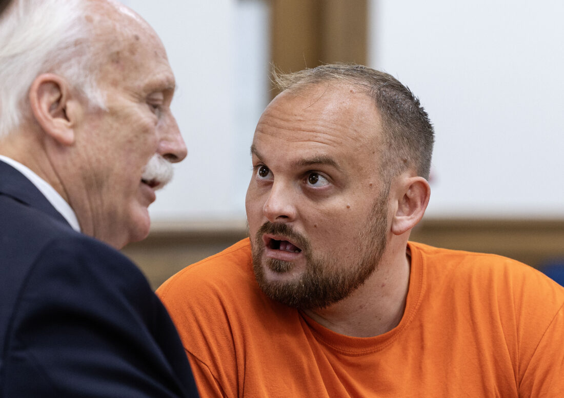 Huston Danker, right, talks with his attorney Leon Spies before his sentencing at the Tama County Courthouse in Toledo on Friday, October 3. Danker was sentenced to life in prison without the possibility of parole. PHOTO BY SAVANNAH BLAKE/THE GAZETTE