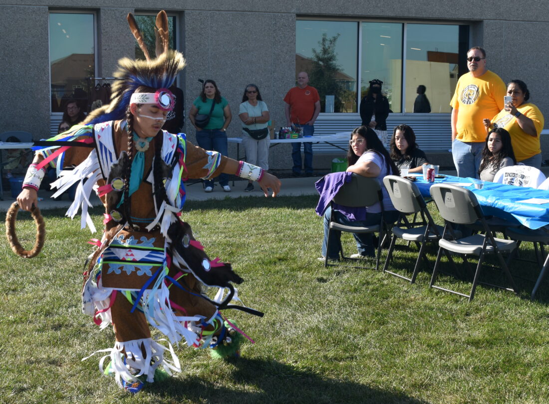 - Tenoch Estrada Snow, a Class of 2025 Meskwaki High School graduate who is now a freshman at MCC, performs a grass dance during the dedication ceremony for the new campus mural on Oct. 10.