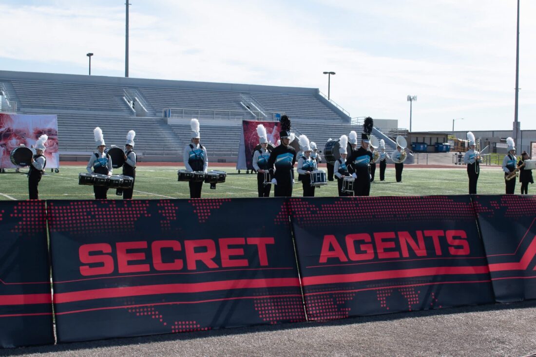 - PHOTO BY SUE CARNAHAN – Drum majors Jordan DeFoe and Josiah Houghton flank the band’s “Secret Agent” front panels on the field inside of Kingston Stadium in Cedar Rapids.