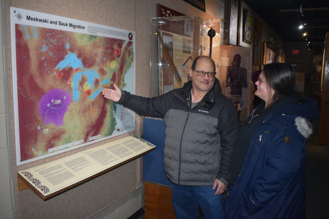 - NEWS CHRONICLE PHOTO BY ROBERT MAHARRY – New Meskwaki Emergency Management Director David Engel and his wife Pam read about the history of the tribe’s migration at the museum and cultural center on Saturday morning.