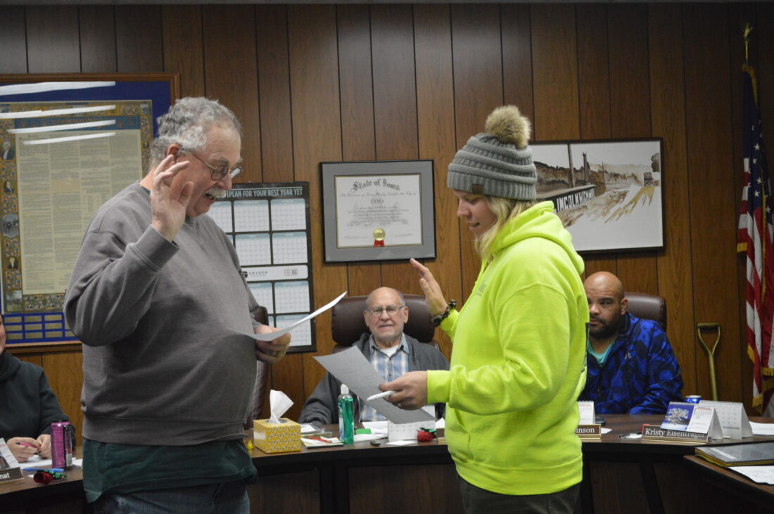 At the end of the regular meeting, council member Kristy Eisentrager took her oath of office before newly elected Chris Smith took his. Outgoing council member Emily Babinat was then presented with a certificate of appreciation.