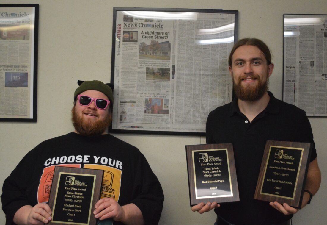 The News Chronicle also won second place in the best front page competition, third place in the Harrison “Skip” Weber Coverage of Court and Crime category, and third place for Continuing Coverage regarding the ongoing controversy over wind energy in Tama County.
