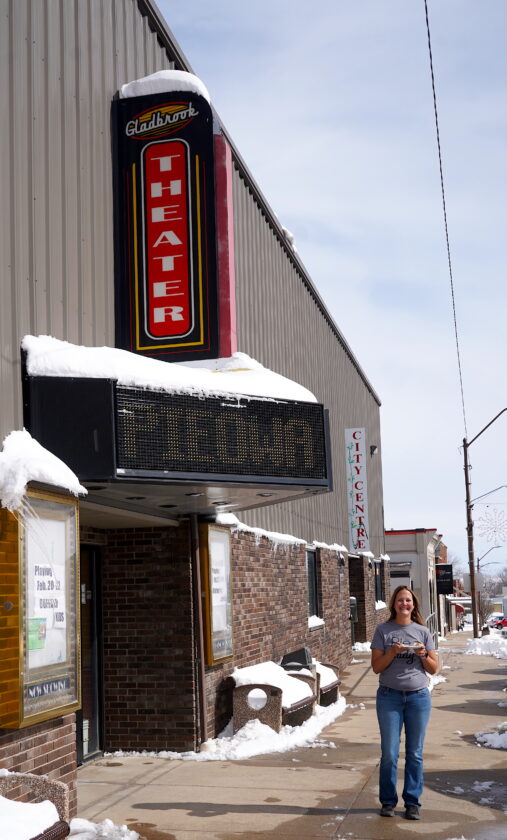 - Gladbrook Theater manager Audra Siddell smiles from behind the concession stand ahead of the “PIEOWA” screening on Saturday, Feb. 21. PHOTO BY RUBY F. MCALLISTER
