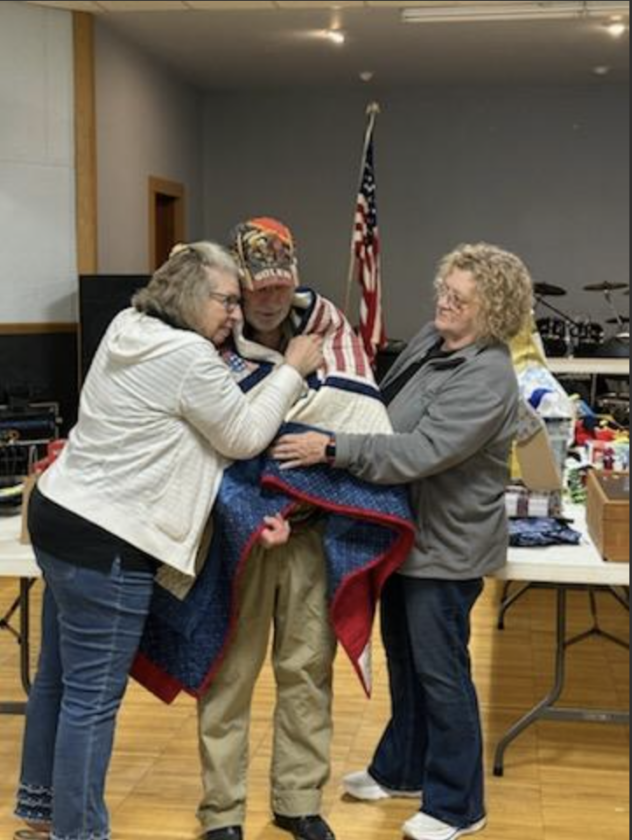 Ben Boland, Iowa Army National Guard of Tama, was awarded a Quilt of Valor at the Fraternity of the Eagles, charity night in Tama. Rosie Lee and Connie B. from South Western Patriotic Quilters presented the quilt.