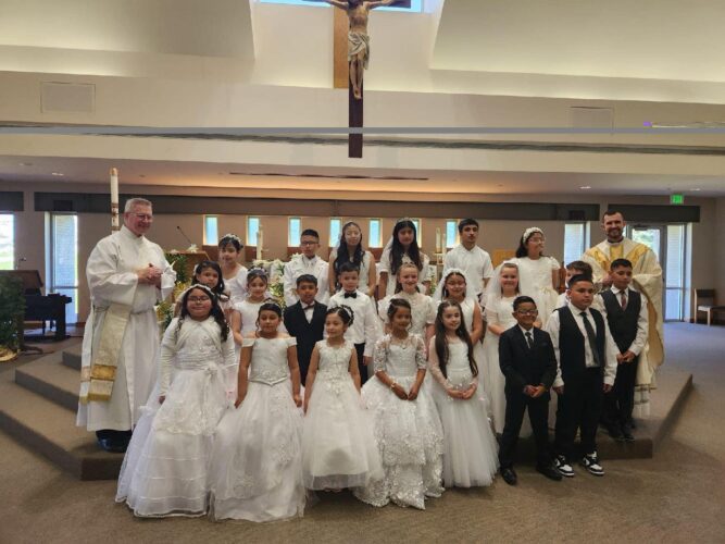 CONTRIBUTED PHOTO — St. Patrick Church in Tama celebrates their First Communion Mass on April 14. Pictured are: Rev. Michael McAndrew, Deacon Stan Upah, Juan Alvarez, Alina Carrillo, Genesis Cervantes, Angel Chavez, Marina Chavez, Daleyza Flores, Celeste Fonseca, Mauricio Garcia, Myles ...