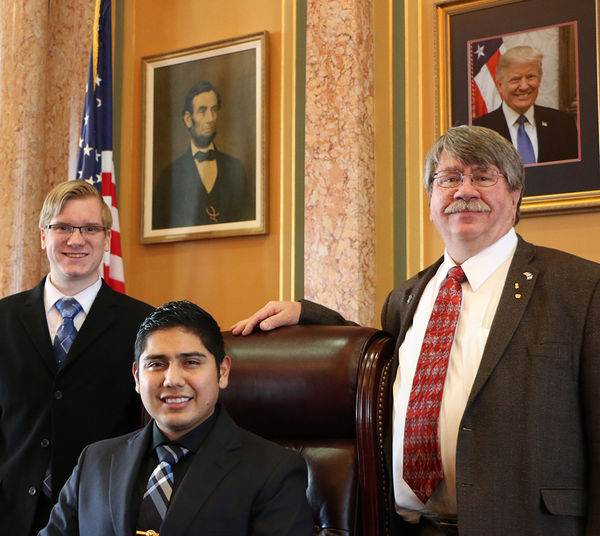 Rep. Dean Fisher (R-Montour) welcomed Moises Fonseca, a student at Marshalltown Community College to the Iowa House of Representatives during a recent visit. Fonseca was in Des Moines to talk with legislators and tour the historic Iowa State Capitol during Community College Day on the Hill. Shown left to right are Rep. Fisher’s clerk, David Blom, Marshalltown, Moises Fonseca, Chelsea and Rep. Fisher. -Photo provided