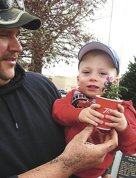 Karsen Raue age 2 with his Dad Curt Raue and the flower he planted for Mother’s Day.