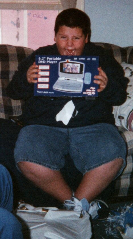 A young Mike excited for his new portable dvd player after opening the wrong gift or two.