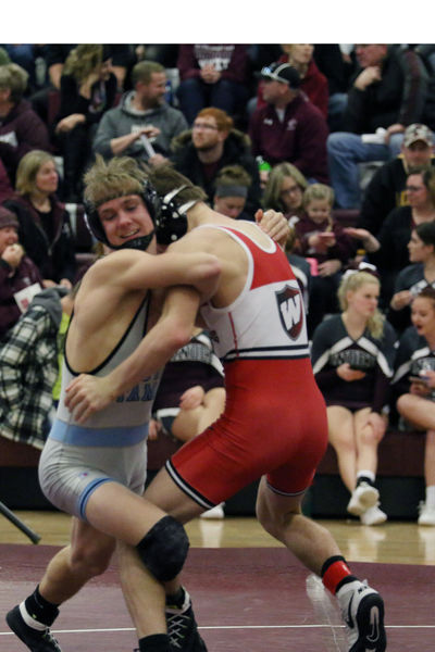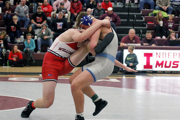 Cael Kellogg grabs the leg of Williamsburg’s Clayton Kempf for a takedown. Kellogg won by decision 10-4. Chronicle Photos/ Allison Graham
