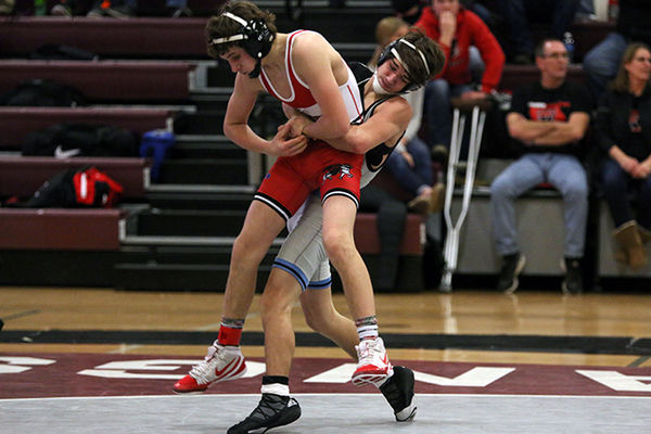Right - Brody Chyma lifts Kaidyn Gryp of Williamsburg. Chyma fell to Gryp during the dual. Chronicle Photos/Allison Graham