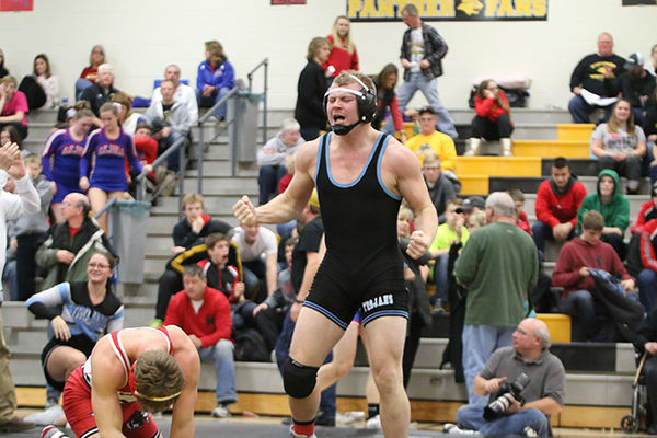 - Dalton Rosenburg celebrates following his win over Gage Hazen-Fabour of Williamsburg on Saturday, Feb. 10. News Herald Photos/Allison Graham
