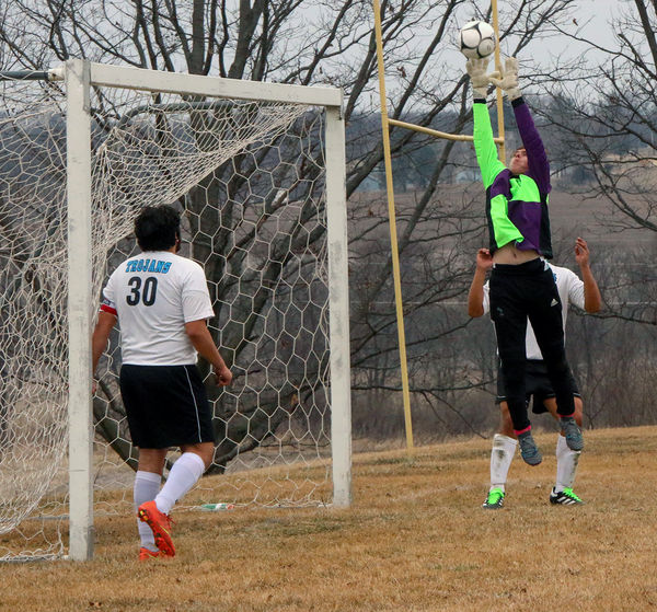 - STC’S goalie, Jake Wilkerson, blocks a corner shot attempt by Grinnell. The Trojans hosted Grinnell in their 2018 season opener on Thursday, April 6. Grinnell took the win 3-1. Chronicle Photo/Allison Graham