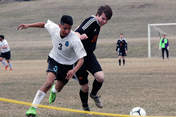 - STC’s Rogelio Flores (3) and Grinnell’s Erik Hektoen (21) fight for possession at the Trojan’s season opener on Thursday, April 5. Grinnell won the contest 3-1.