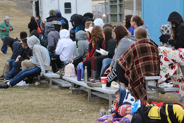STC’s fan section bundles up with hoodies, coats, blankets, etc. for the Trojans season opener against Grinnell on Thursday, April 5. Chronicle Photos/Allison Graham