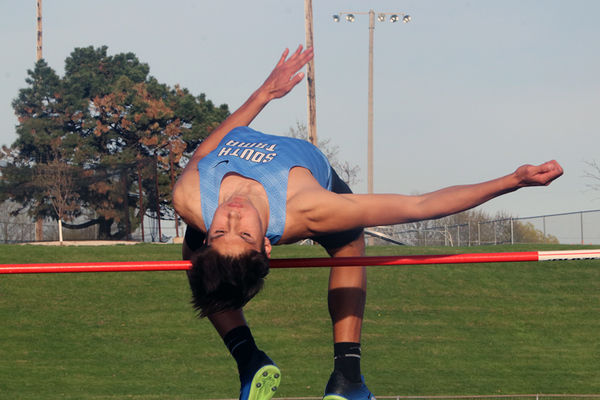 - STC’s Keith Keahna sails over the high bar on Tuesday, April 23. Keahna took first in the event with a jump of 6’4. News Herald Photo/Allison Graham