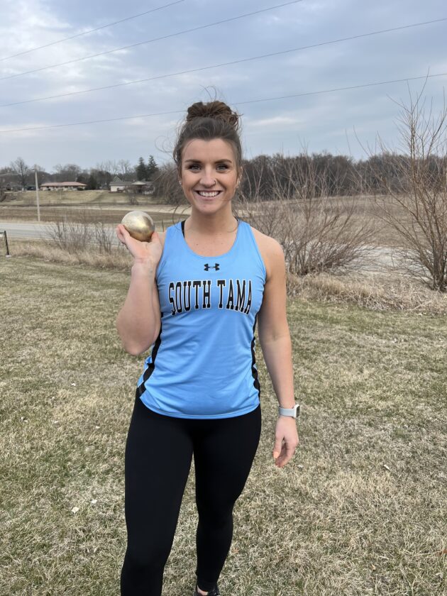 Continuing South Tama’s success in various field events was Senior Kortney Babinat. Another returning state qualifier, Babinat’s main event has been the shot put over the last few years, but now she has turned her focus to qualifying for state in the throwing double.