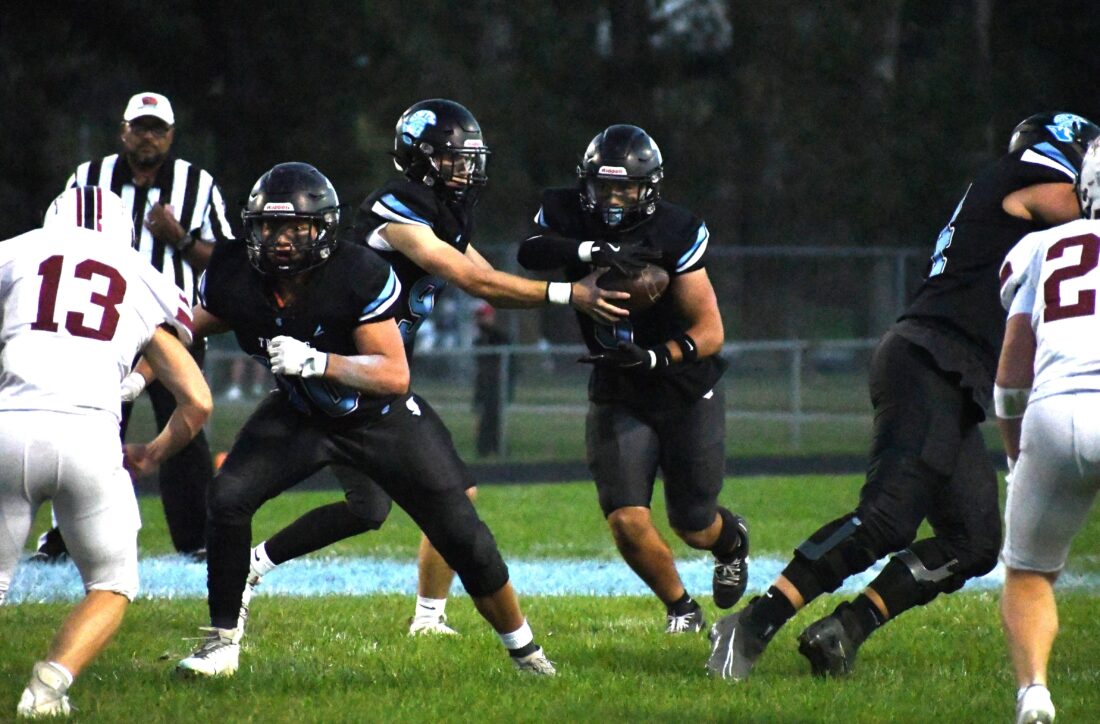 NEWS CHRONICLE PHOTO BY STEVE BRANT – STC sophomore quarterback Ryan Brant hands the ball off to junior running back Eric Medina against PCM. Senior Marcus Bear leads the way in blocking (left).