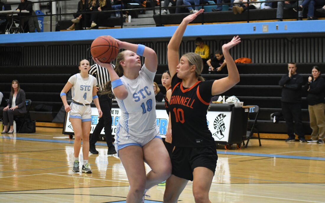 - NEWS CHRONICLE PHOTO BY STEVE BRANT – STC sophomore Scout Ridout defends against Grinnell.