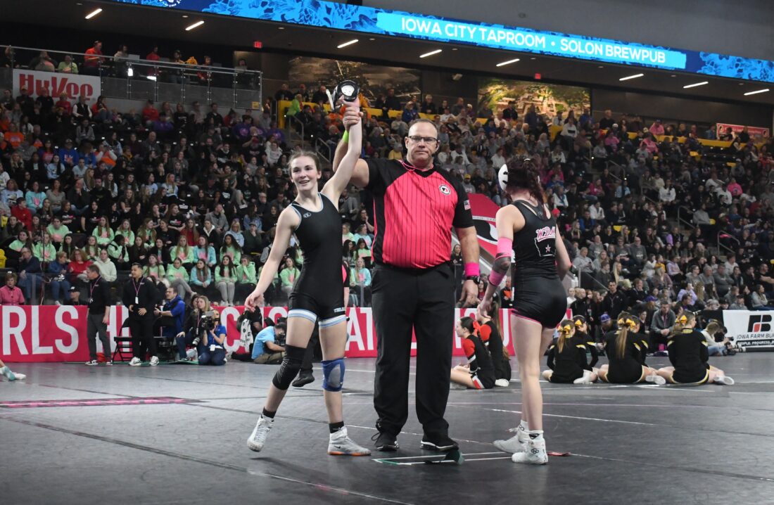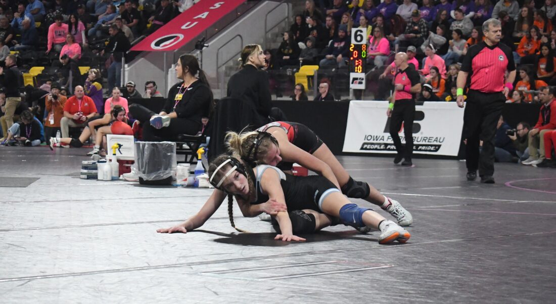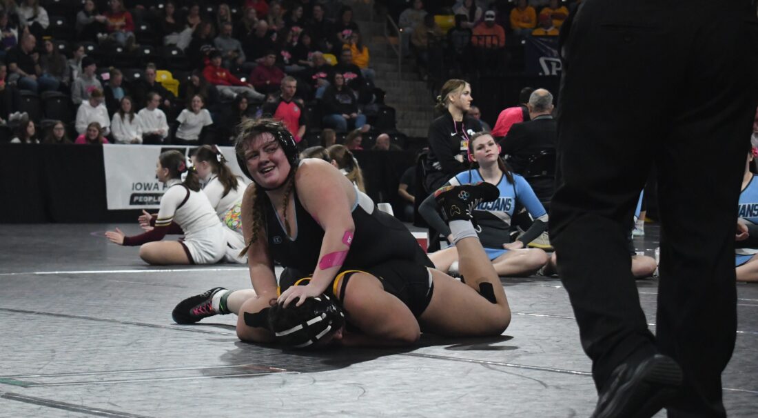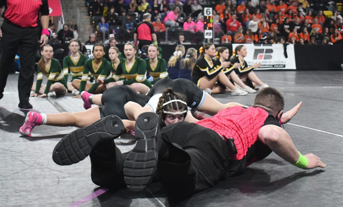 - STC sophomore Maylee Rucker looks to the referee as she pins her quarterfinal opponent: Meredith Kaump of Cedar Rapids Kennedy.