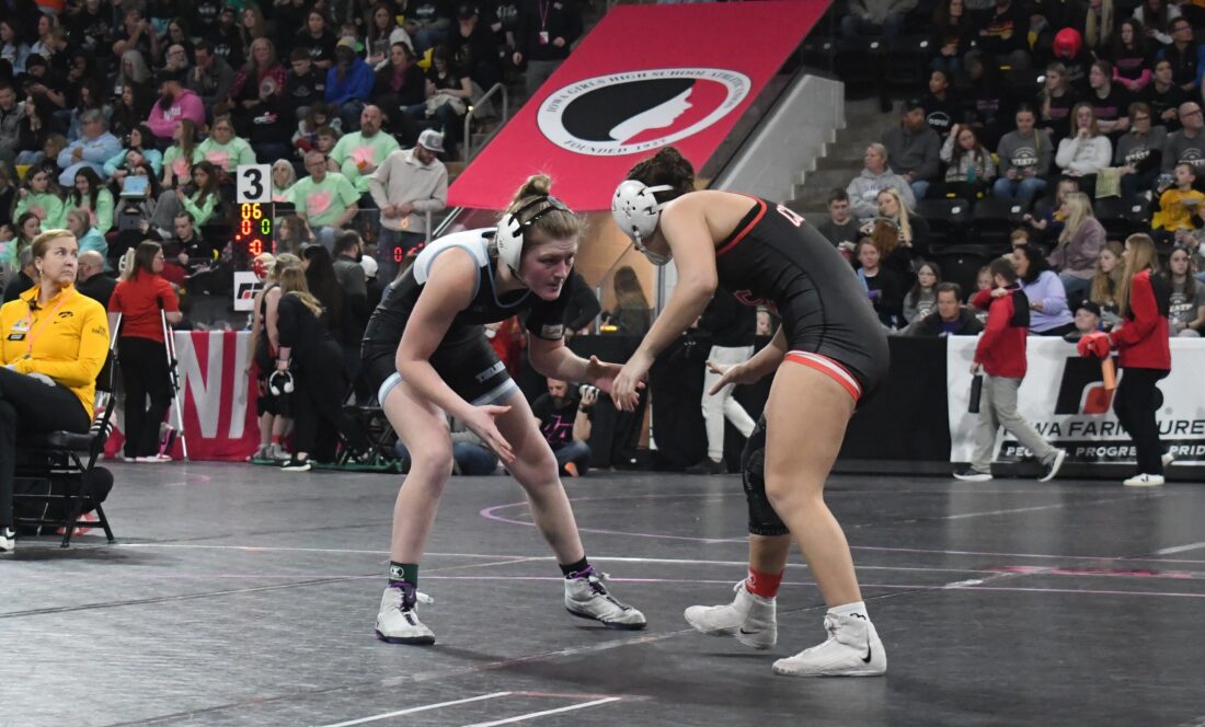 STC sophomore Maylee Rucker wrestles against #1 seed Calista Rodish of Raccoon River Northwest in the semifinals at 140.