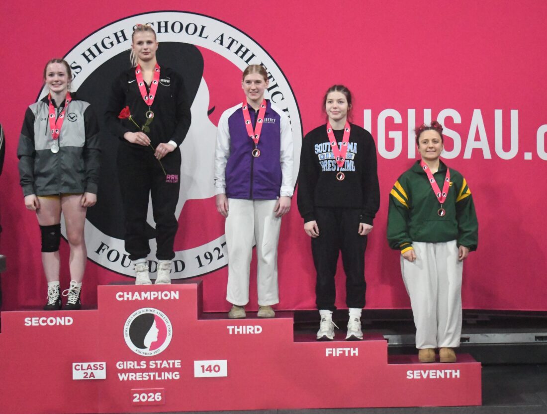 - STC sophomore Maylee Rucker stands on the medal podium for her 5th place finish at 140 lbs.