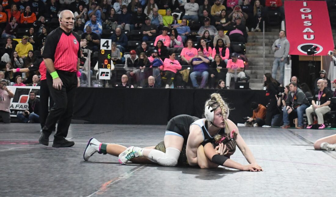 STC junior Brooklyn Mitchell wrestles in her opening match at the state tournament.