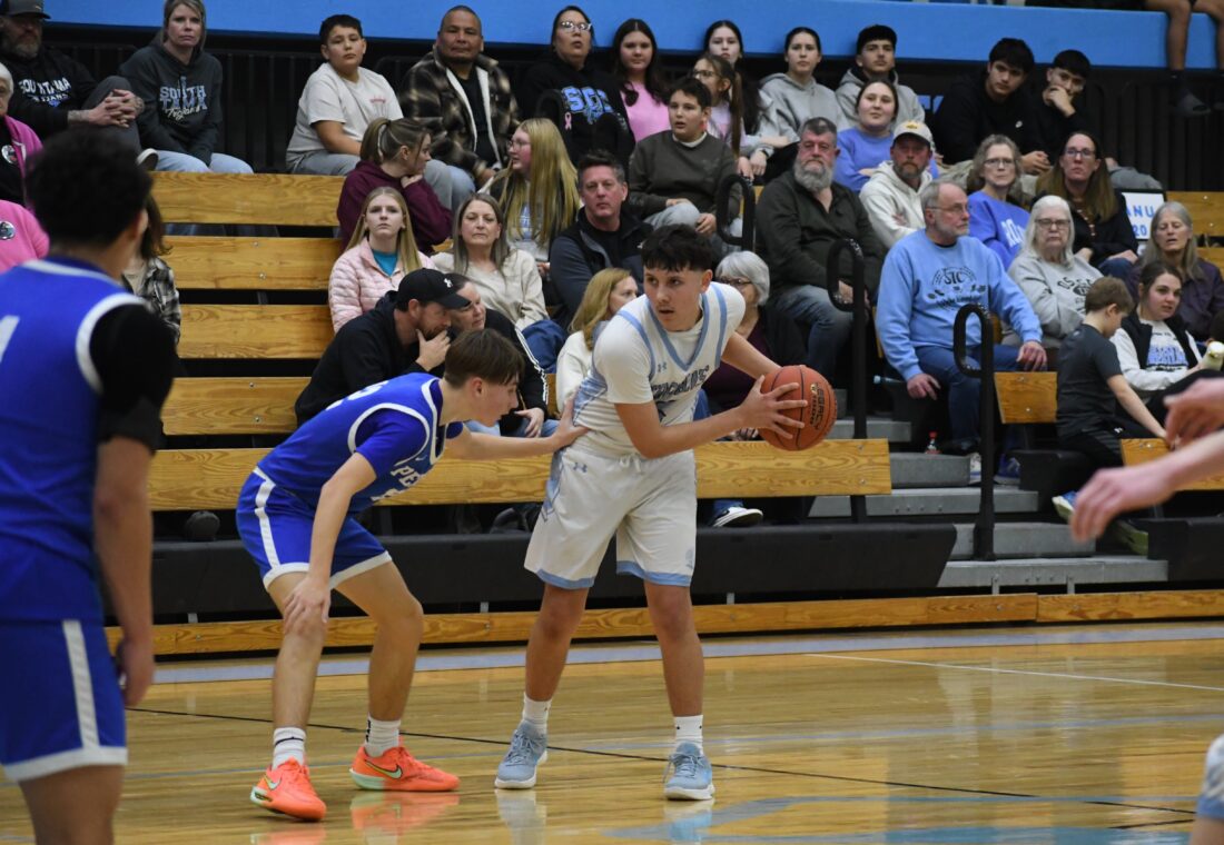 STC sophomore Ryan Brant puts on the full-court press against Perry.