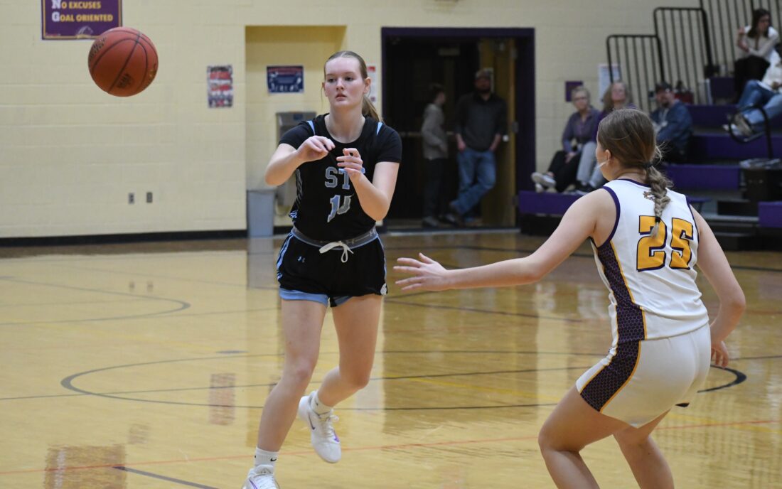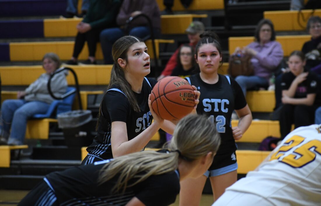 - STC sophomore Stella Zmolek eyes the basket on a free throw against East Marshall. STC junior Taylor Dolezal passes the ball against East Marshall.