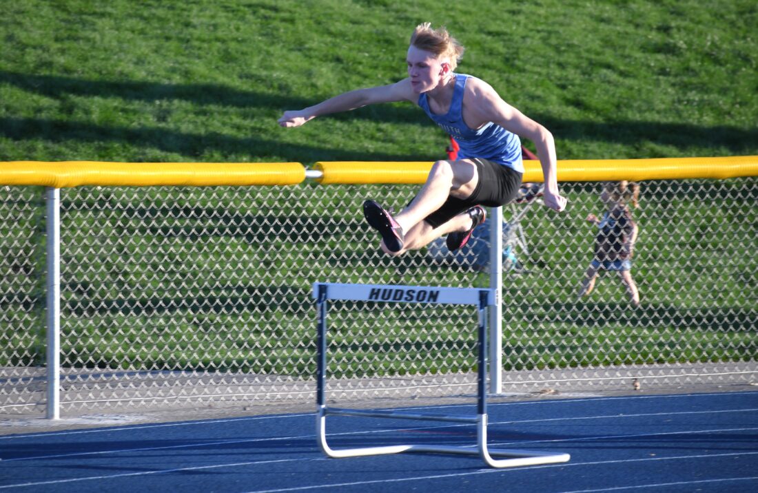 STC junior Josiah Houghton clears the first hurdle in the 400 hurdles in Hudson. Houghton finished as runner-up in the race.