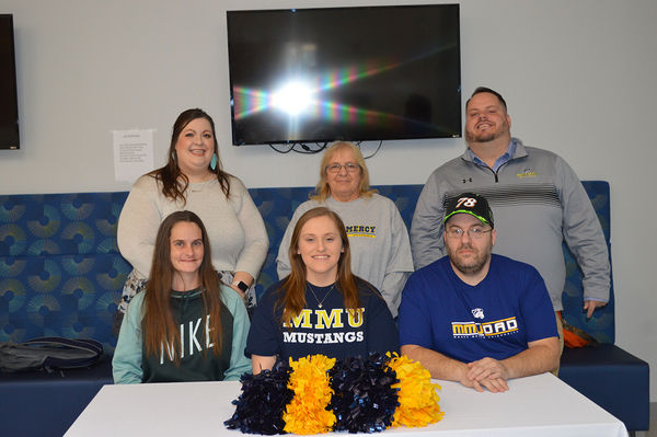South Tama County senior basketball cheerleader, Jessica Timm (center), signed her Letter of Intent to cheer at Mount Mercy next year. Timm was joined by her Mom, Jennifer Hickman and Dad, Rod Timm and grandma Kathy Timm as well as her high school cheer coach Allison Graham and Mount Mercy ...