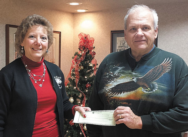 State Bank of Toledo Executive Vice President Donna Princehouse presents a check to Adopt A Family committee member Dan Ferris on behalf of the bank. The annual fund drives benefits less fortunate area residents providing Christmas presents and food during the holiday season.